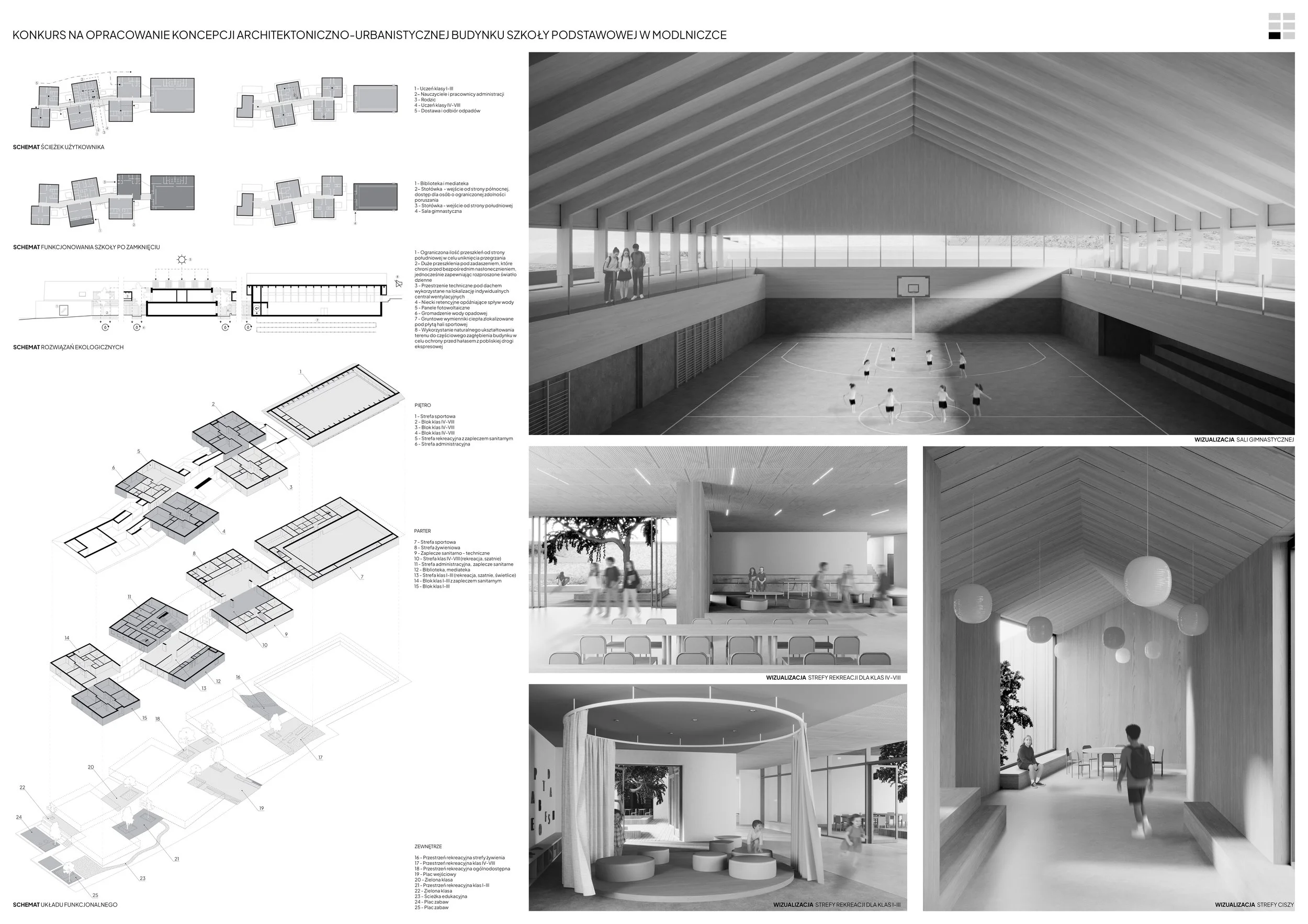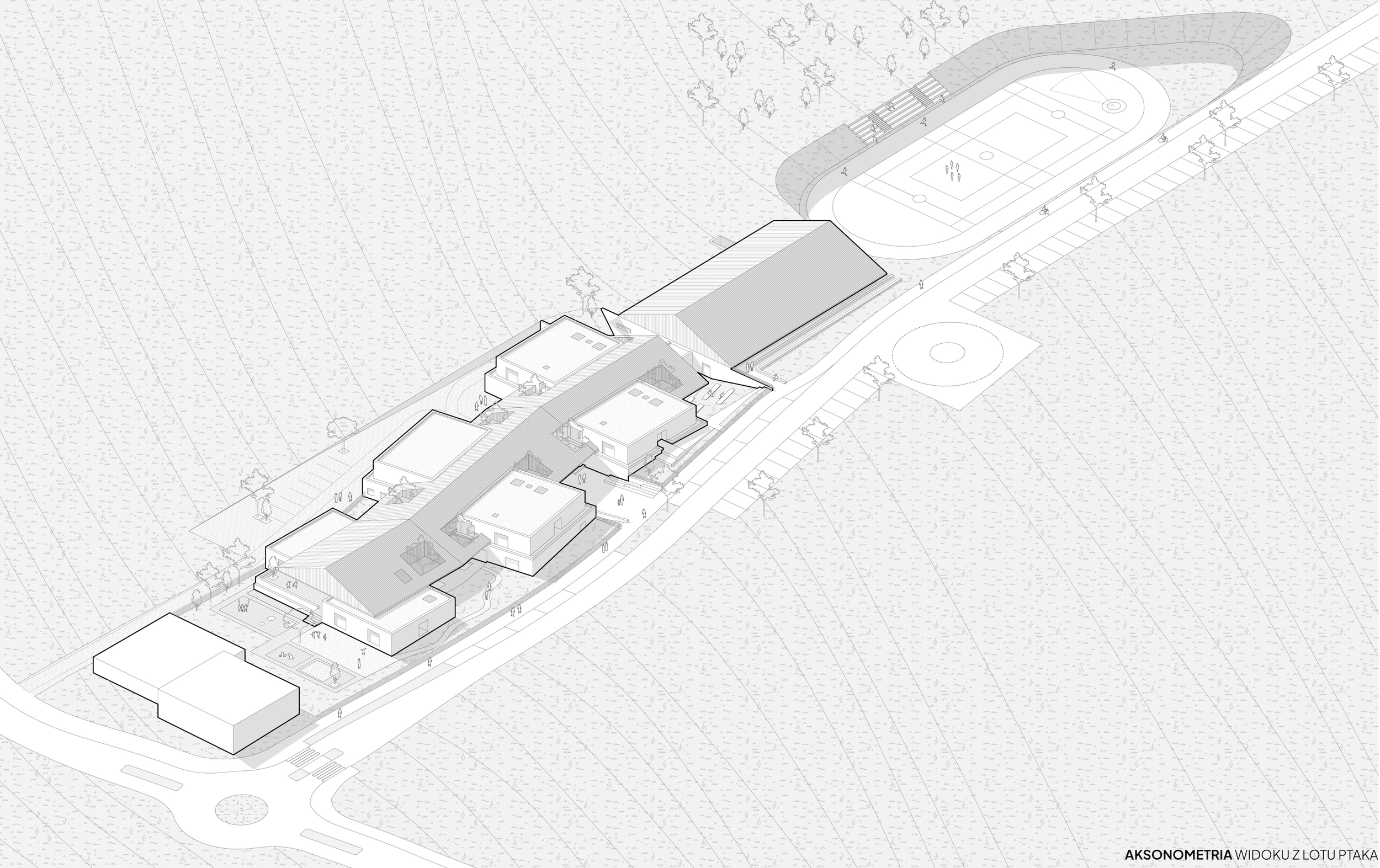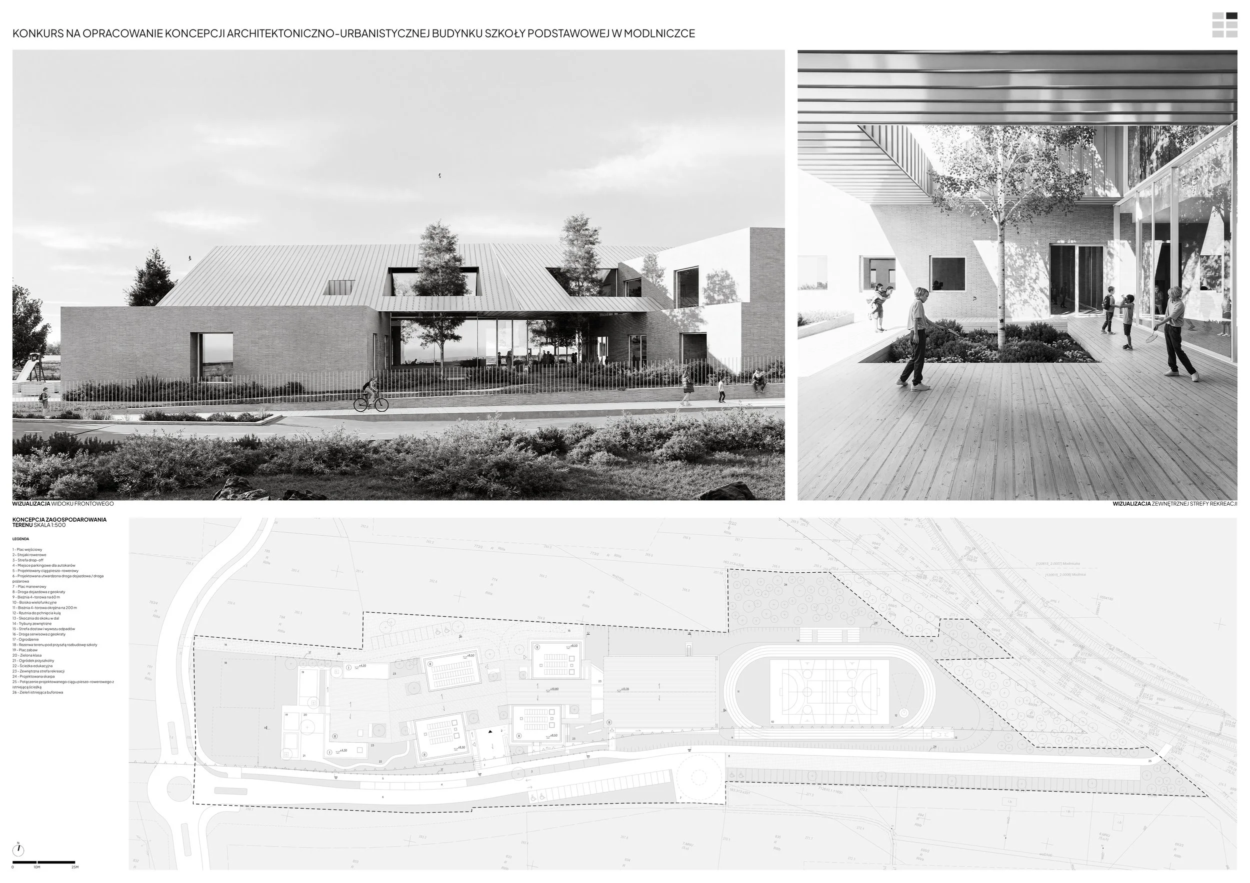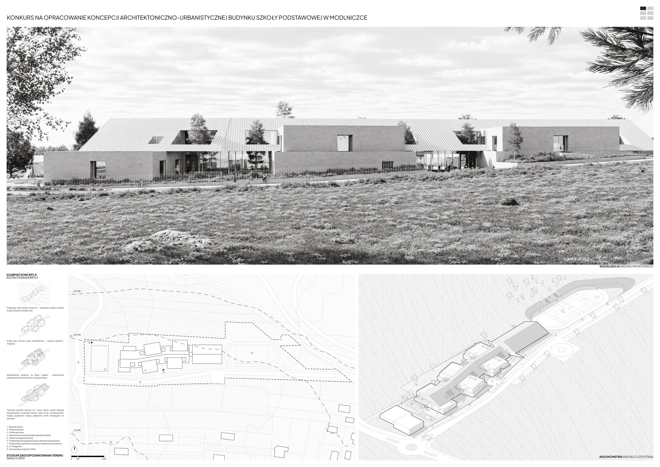 The design concept for the school building in Modlniczka is based on the traditional linear layout of Polish villages, where buildings were arranged along a road, and agricultural fields created a characteristic striped rhythm. In such a layout, the road served not only a transport function but also a social one – it was a place for meetings, exchange, and integration.