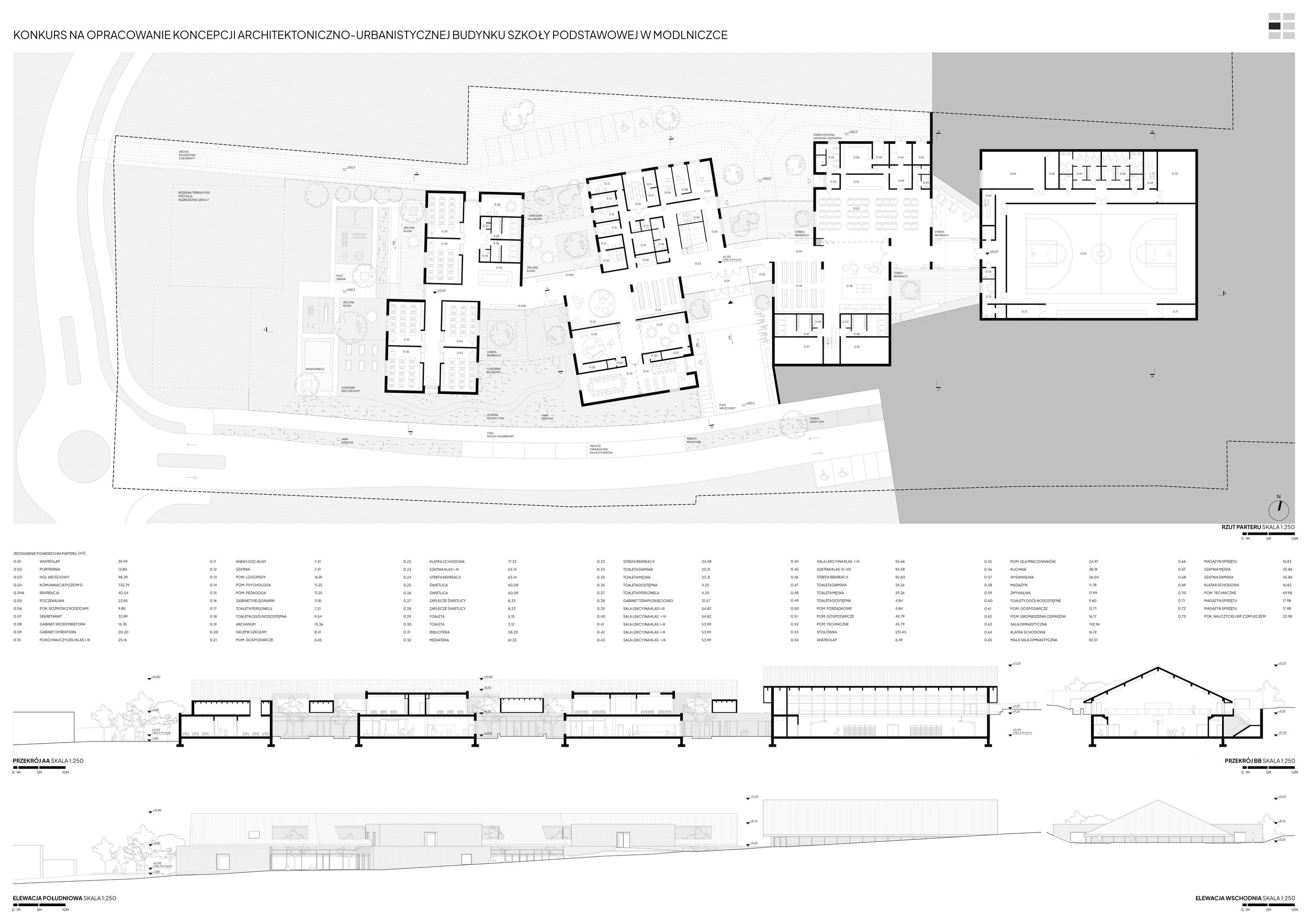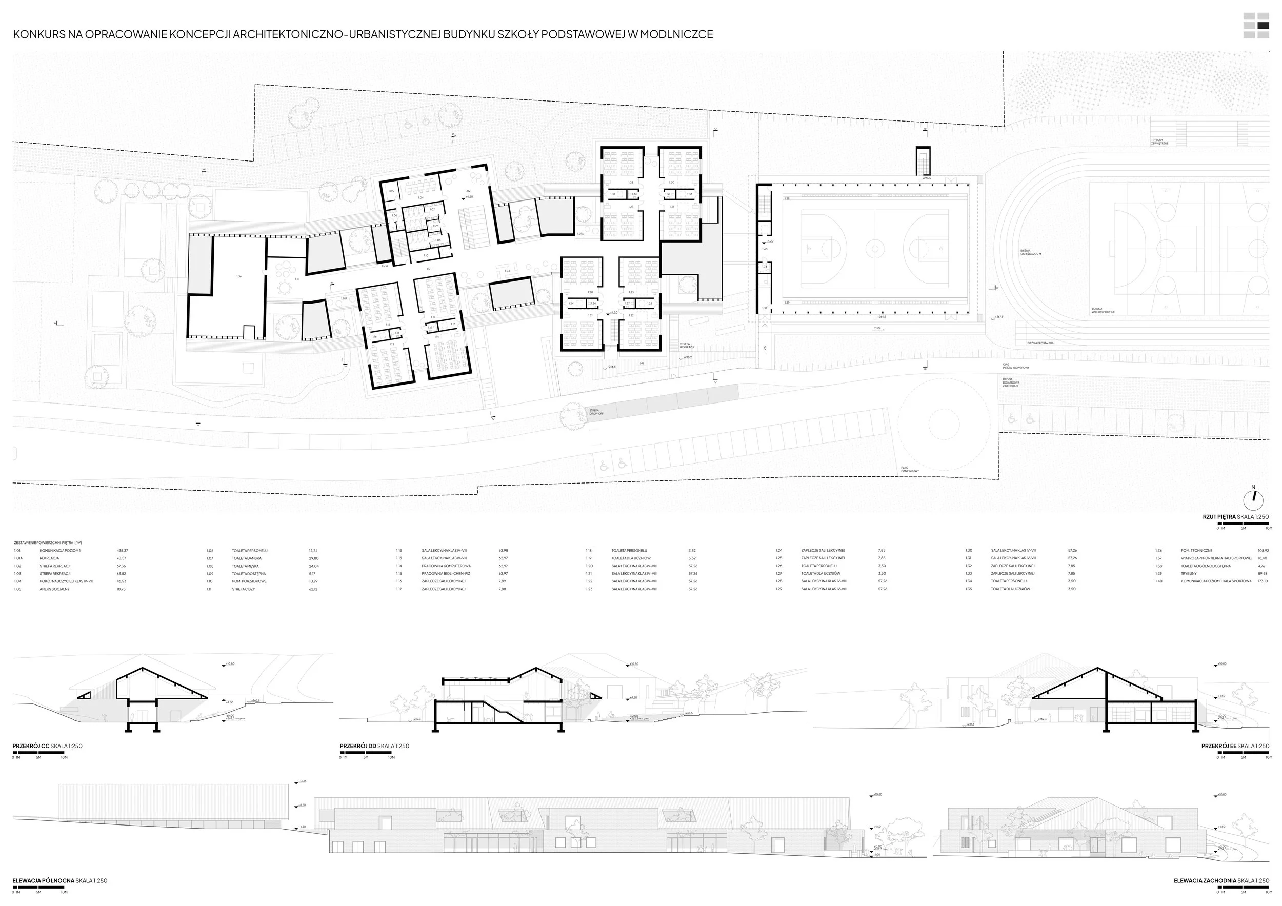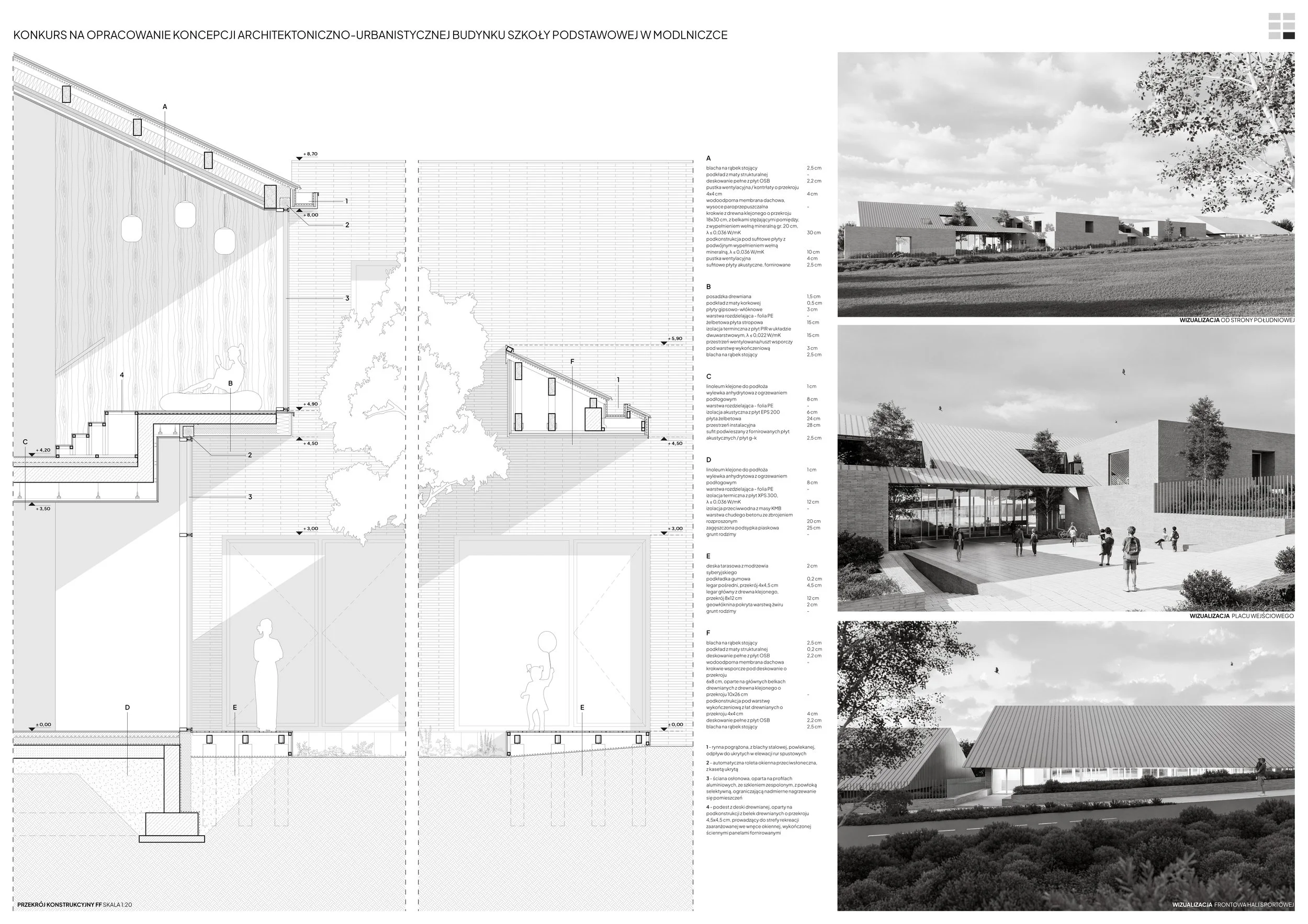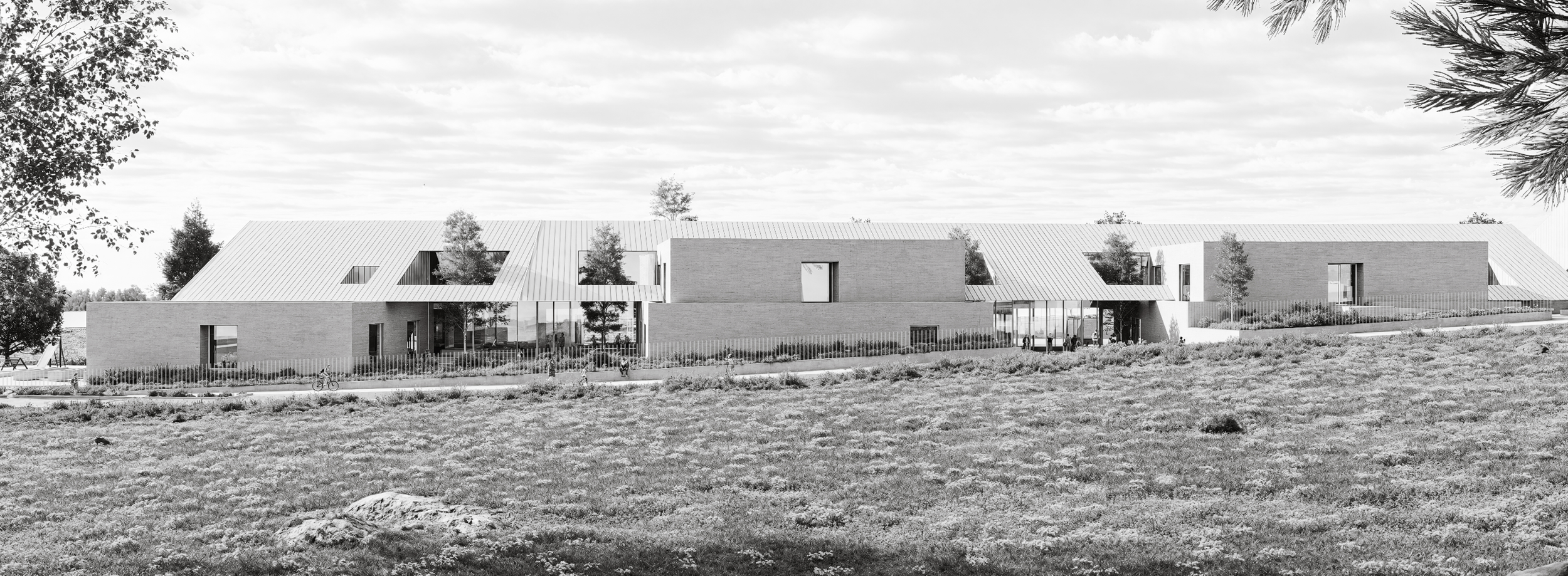 The design concept for the school building in Modlniczka is based on the traditional linear layout of Polish villages, where buildings were arranged along a road, and agricultural fields created a characteristic striped rhythm. In such a layout, the road served not only a transport function but also a social one – it was a place for meetings, exchange, and integration.