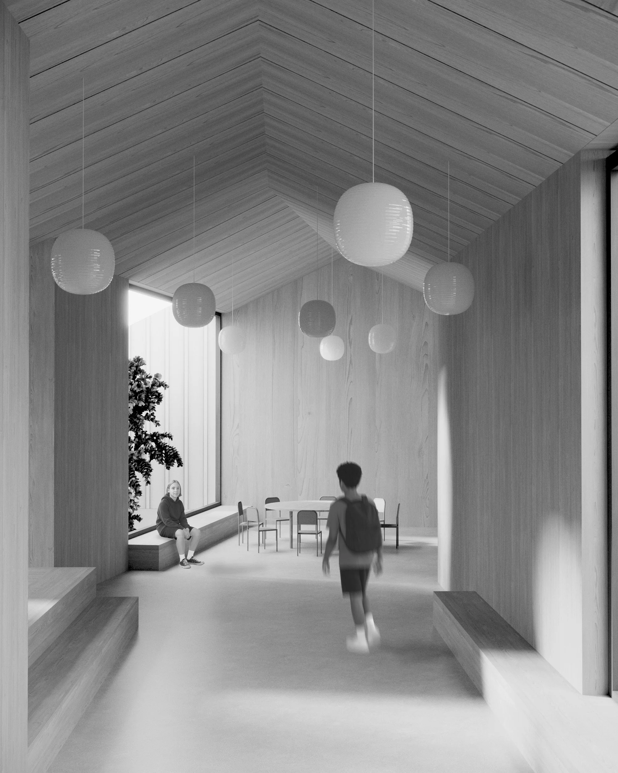 Similarly, in our proposal, the central element of the school is the internal “street” – the main corridor around which all educational, recreational, and administrative functions are organized. This layout, drawing from local tradition, has been reinterpreted into a modern architectural language, where offset roofs and a sequence of functional blocks create a friendly, open, and flexible space.