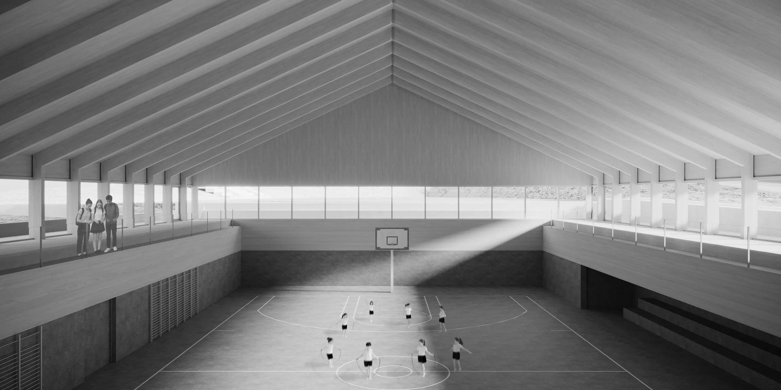 Mechanical ventilation will be provided by rooftop units, automatically controlled according to daily cycles. Classrooms will feature air conditioning and heat recovery via ground heat exchangers located under the sports hall slab.